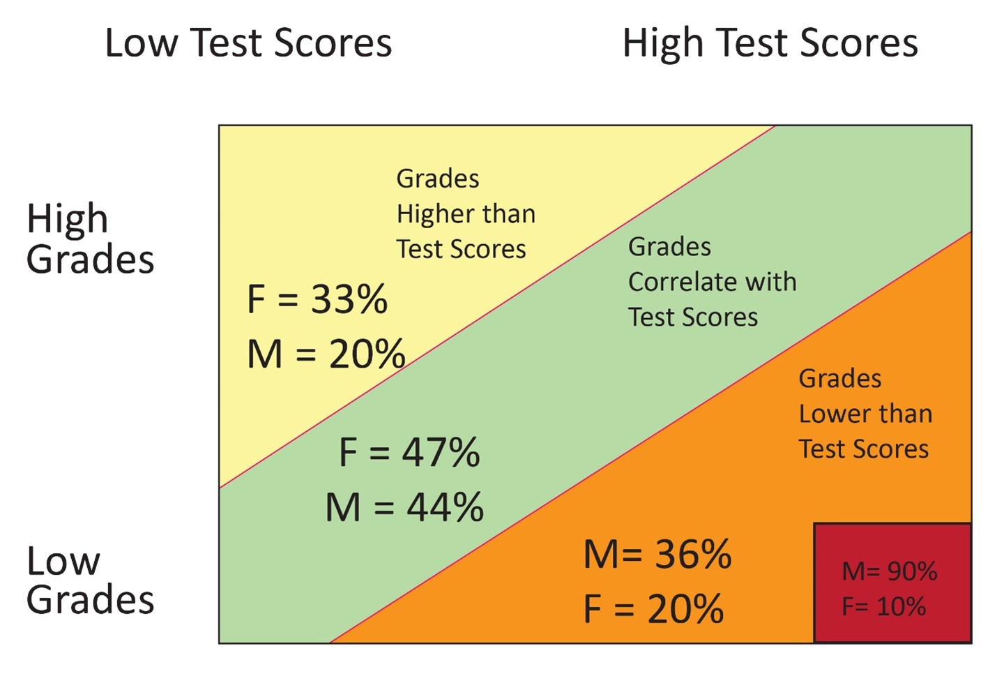 The disconnect between grades and knowledge has been thoroughly documented when Nancy S. Cole, when she was President of the Educational Testing Service, co-authored a study of millions of students taking thousands of tests. The book, Gender and Fair Assessment, reported some 36% of male students were given significantly worse grades than their test scores warrant. At the highest levels on tests and the lowest grades, it is boys 90% and girls 10%. We need these smart boys as college graduates and in STEM. But there are 2 million boys missing from college every year, boys who know just as much as students in college.